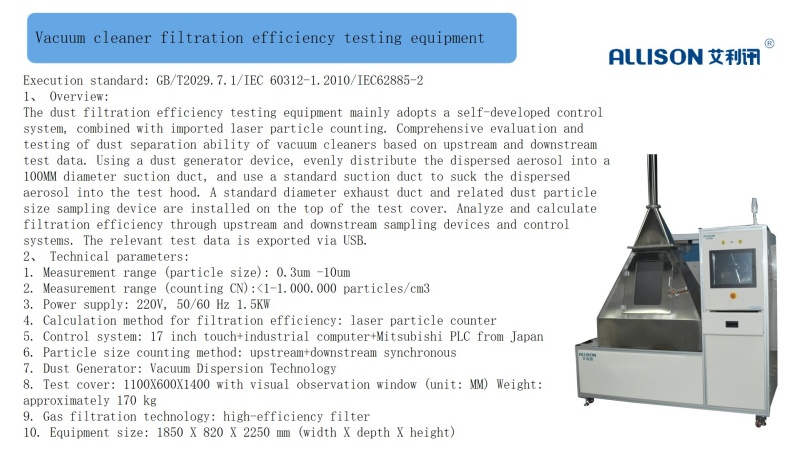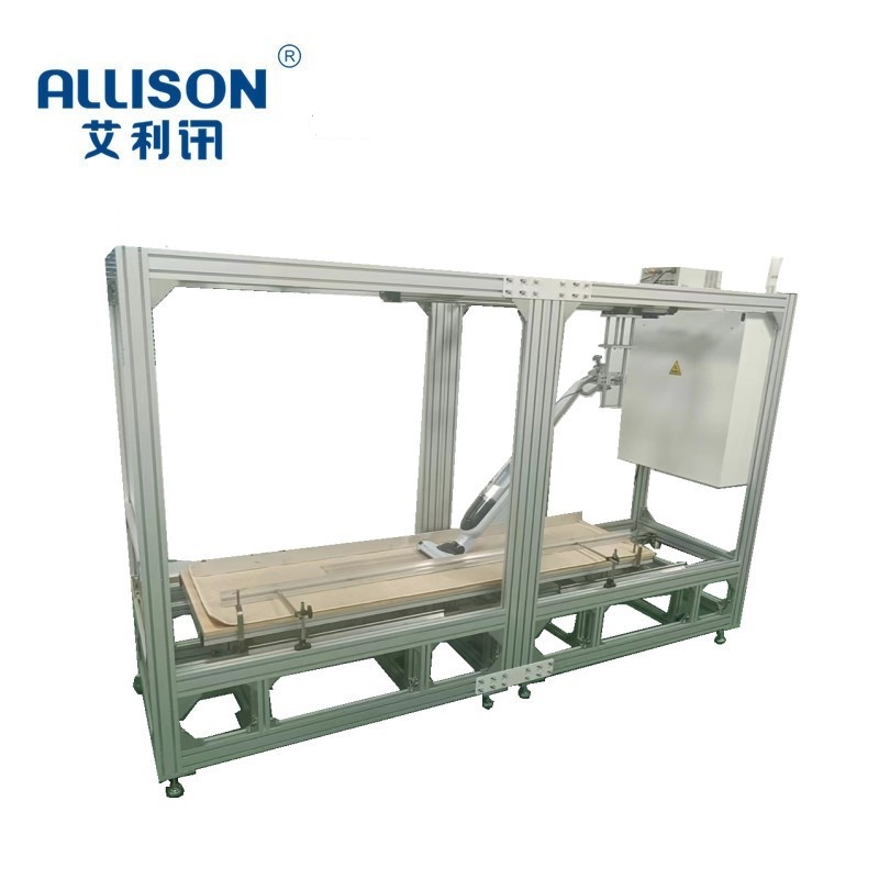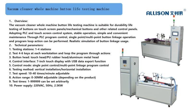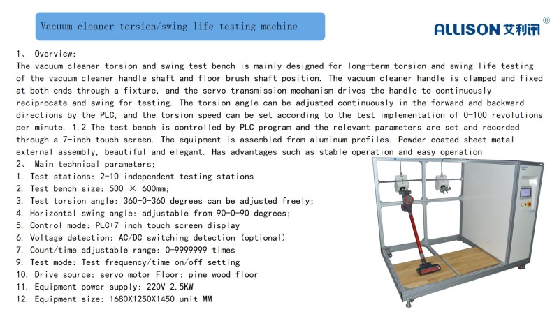 The mechanical operation test device is mainly suitable for testing the resistance of vacuum cleaner carpet movement. During the test, it simulates the actual ground walking situation of the vacuum cleaner and tests the friction force generated between the cleaning head and the carpet. Lay a carpet on the test bench, allowing the vacuum cleaner to move back and forth on the test bench. The workbench can move back and forth in a straight line at a speed of 0.5m/s, with an effective constant speed travel of 700mm and a total travel of 1200. The testing machine is equipped with a vacuum cleaner specific clamping and fixing mechanism, and can perform on-off life testing on the tested vacuum cleaner