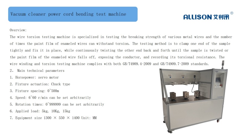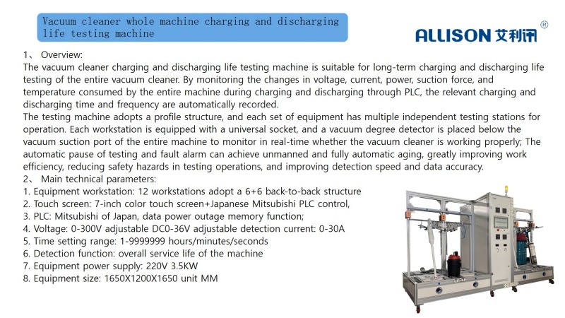 The handheld vacuum cleaner bare machine drop test machine is mainly used to simulate the durability life test of the lifting and placing action of vertical vacuum cleaners in actual use. Lift the upright vacuum cleaner vertically and then freely drop it vertically onto a pine board. By increasing the height of the testing vacuum cleaner within the range of 0-500MM, the pneumatic release mechanism instantly releases the vacuum cleaner that has been raised to a certain height until the brush base falls to the center of the pine board. Periodic tests are conducted through PLC program control. The testing machine has strong universality, simple operation, convenient control, and low failure rate