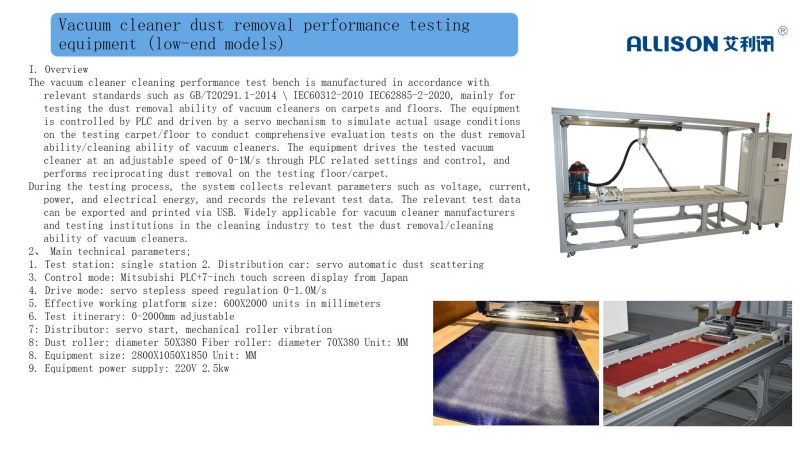 The testing machine is manufactured in accordance with the testing requirements of IEC60312 standard. Through a 7-inch touch screen display, the PLC controls the deceleration motor to drive the drum action. Rotate the drum at the set rotational speed for the floor brush head drum test. Suitable for conducting drum impact life testing on vacuum cleaner floor brushes. The drum is welded with 5MM steel plates, and the bottom plates on both sides are made of 20MM pine boards. Controlled by a 7-inch touch screen, durability tests are conducted at the set testing speed and frequency. The device has strong universality, simple operation, convenient control, and low failure rate.