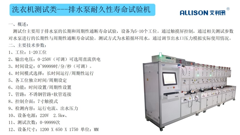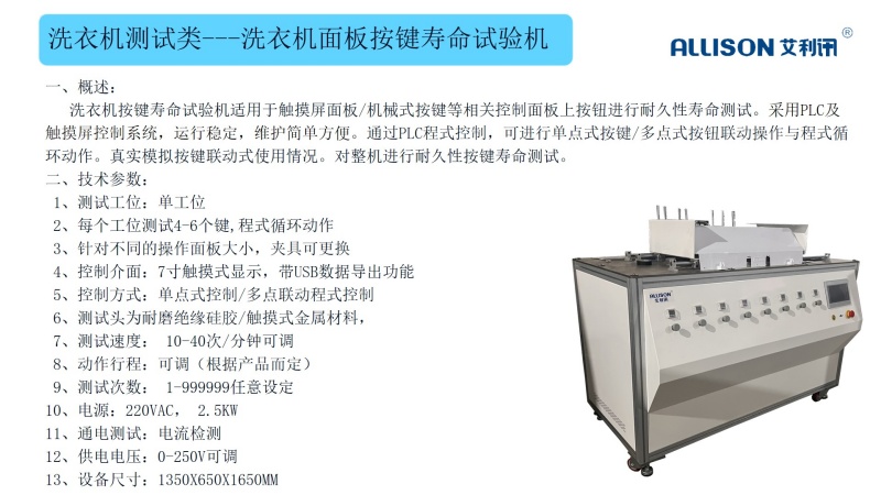 产品型号: 产品固定方式: 测试速度: 测试次数: 设备尺寸: 概述: 进水管脱扣寿命测试台主要用于快插式进水管脱扣耐久性试验,检测质量可靠性,适用对插式进水管进行脱扣断开/连接能力老化试验。以步进电机作为驱动源,带动夹具作插拔、脱扣运动,从而完成“打开与闭合”的往复寿命动作, 通过PLC控制,配合灵活多变的夹具,设备可满足多种洗衣机进水管脱扣寿命测试,通用性强,操作简单,控制方便,故障率低