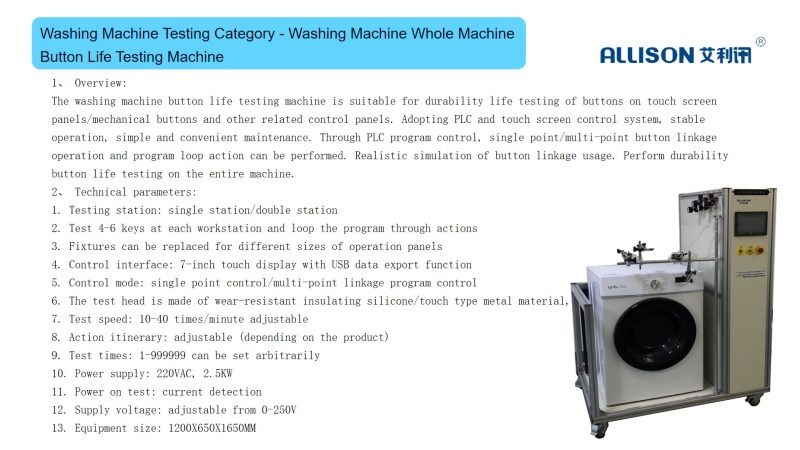 Washing machine suspension damping force testing equipment, suitable for testing the damping force and tensile force of washing machine suspension rods. Commonly used in over 95% of washing machine suspension products on the market. The test bench simulates the reciprocating damping force data of the washing machine suspension rod during use, and collects and records the tested force values in real time through pressure sensors. Action control and force value acquisition are carried out by PLC. Simulate action testing with pre-set test times, running speed, etc. The PLC reads and records real-time force value changes and generates curves. And statistically analyze and process the experimental data; Then output test reports and characteristic curve diagrams in various required formats