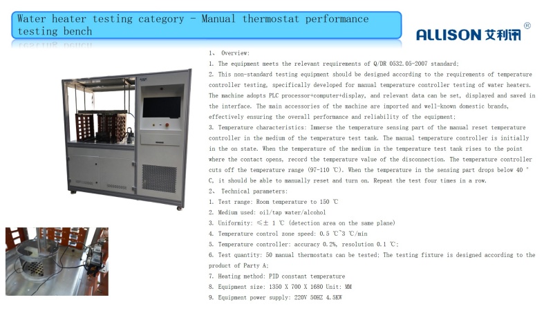 Mainly targeting the performance indicators and service life tests of storage type electric water heaters; The testing items include performance testing, energy efficiency testing, voltage resistance testing, flow testing, temperature testing, power consumption testing, etc.