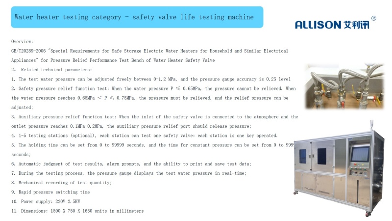 Performance testing bench for instant gas water heaters; The testing items include performance testing, energy efficiency testing, voltage resistance testing, flow testing, temperature testing, power consumption testing, etc.According to GB 6932-2015 "Household Gas Rapid Water Heater" and GB 20665-2015 "Energy Efficiency Limits and Grades for Household Gas Rapid Water Heater and Gas Heating Water Heater" GB/T 20289-2006 "Household Gas Rapid Water Heater Manufacturing and Design. Adopting PLC industrial control computer control method, it can carry out project programming operation, process automatic detection, data tracking and collection, conclusion discrimination and classification, automatic storage of detection data, which is convenient for future search, analysis, statistics and printing.