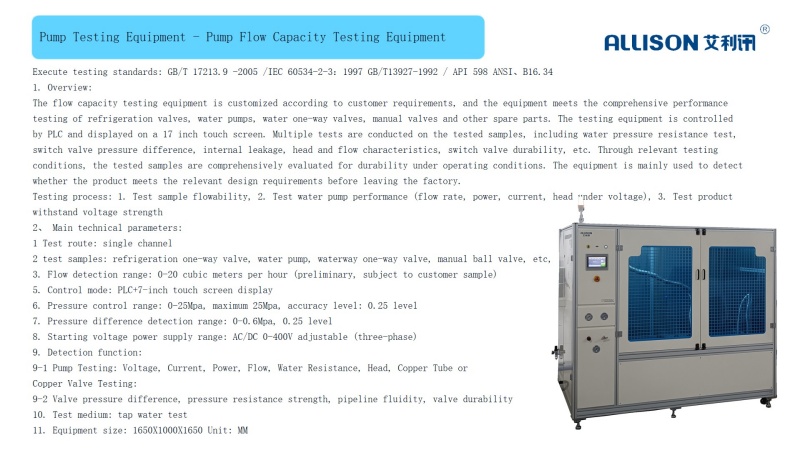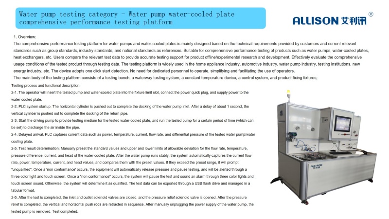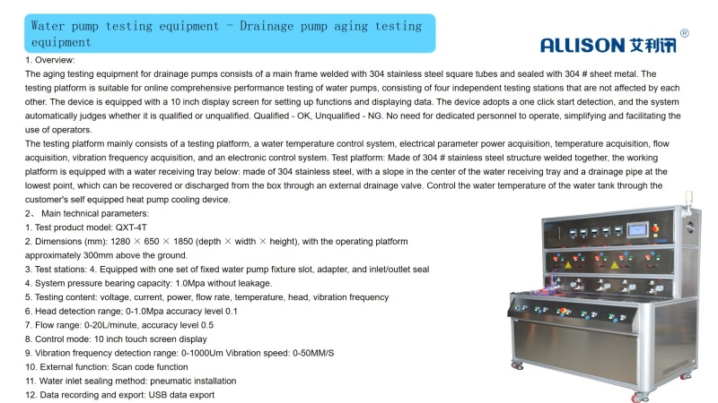 The aging testing equipment for drainage pumps consists of a main frame welded with 304 stainless steel square tubes and sealed with 304 # sheet metal. The testing platform is suitable for online comprehensive performance testing of water pumps, consisting of four independent testing stations that are not affected by each other. The device is equipped with a 10 inch display screen for setting up functions and displaying data. The device adopts a one click start detection, and the system automatically judges whether it is qualified or unqualified. Qualified - OK, Unqualified - NG. No need for dedicated personnel to operate, simplifying and facilitating the use of operators