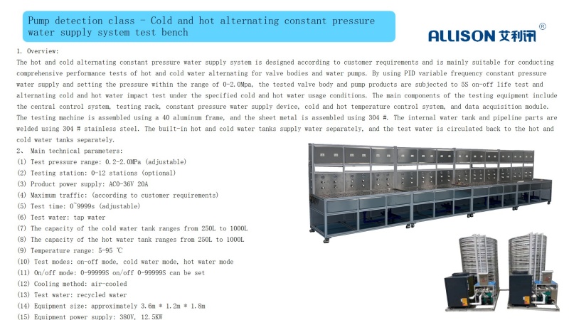 The quantitative/flow pump discharge flow characteristic testing equipment is customized according to customer requirements and actual production testing. The testing equipment is mainly used to compare and test the relative output flow accuracy of valve bodies, pumps and other related products under water testing. The control system reads product parameters such as on/off and flow rate through PLC for data comparison and judgment. Using weighing method to achieve multi flow co measurement. Our independently developed control system controls the product with adjustable voltage supply of AC0-300V \ DC0-36V. The PLC controls the water supply flow rate and collects data on the output water flow rate. The above and lower limits are used to determine whether the tested product is qualified or unqualified.