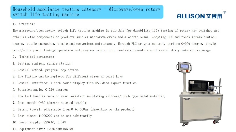 Product Mode: Fixed mode of products: Test Speed: Number of tests: Equipment size: Description: The door opening and closing tester is mainly used for durability testing of door hinges in household appliances, to detect the quality and reliability of the door body, and is suitable for conducting opening/closing ability tests on cabinet doors. The stepper motor serves as the driving source, driving the push rod to perform reciprocating rotational motion, thereby completing the reciprocating action of "opening and closing" the cabinet door. By using PLC control to perform up and down door opening tests on the product, coupled with flexible and versatile fixtures, it can meet various small household appliance door opening and closing tests.