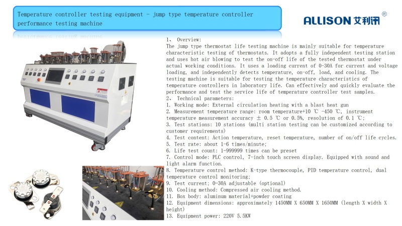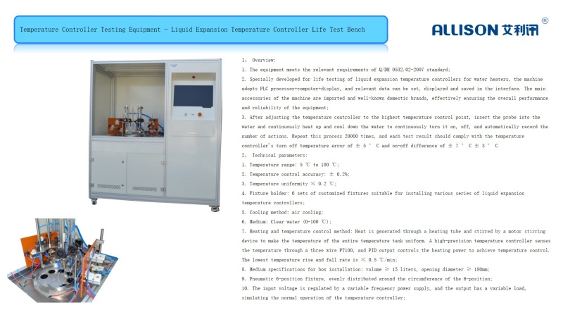 This equipment is suitable for life testing of liquid expansion type temperature controllers and jump type temperature controllers. Refer to relevant testing standards and conduct life tests on manual reset temperature limiters and automatic reset jump type temperature controllers according to customer requirements; Users can choose to test with or without load according to the experimental requirements; The test bench adopts PLC main control, touch screen human-machine interface display, and the main accessories are imported and well-known domestic brands. The work is stable and reliable, and the operation is simple and convenient.
