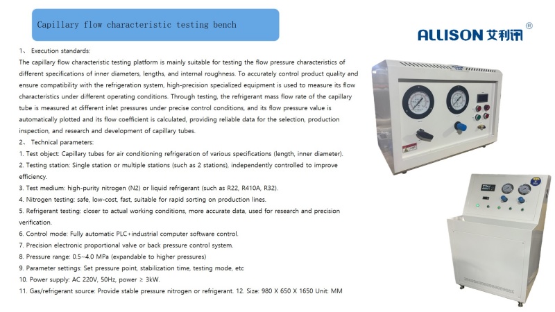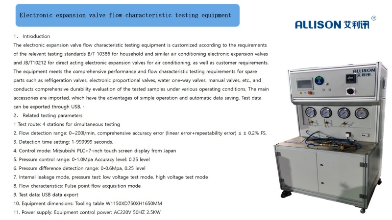 The electronic expansion valve flow characteristic testing equipment is customized according to the requirements of the relevant testing standards B/T 10386 for household and similar air conditioning electronic expansion valves and JB/T10212 for direct acting electronic expansion valves for air conditioning, as well as customer requirements. The equipment meets the comprehensive performance and flow characteristic testing requirements for spare parts such as refrigeration valves, electronic proportional valves, water one-way valves, manual valves, etc., and conducts comprehensive durability evaluation of the tested samples under various operating conditions. The main accessories are imported, which have the advantages of simple operation and automatic data saving. Test data can be exported through USB.