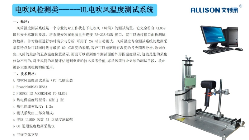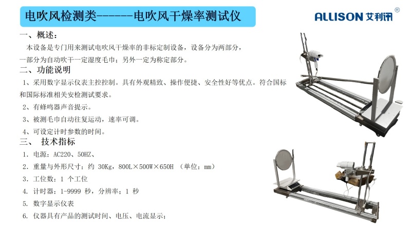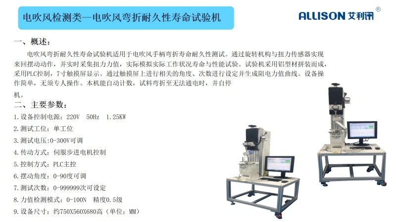 产品型号: 产品固定方式: 测试速度: 测试次数: 设备尺寸: 概述: 电吹风检测工装主要用于电吹风零配件进行在线检测,适用于产线快速检测与全检使用,针对电吹风半成品检测。采用双工位交替切换测试,通过切换工装实现双工位单人操作。主要检测半成品加热在烧烟工况,通过时间判断产品是否合格与不合格。并带有报警检测功能,实时判断与声光报警,合格--绿灯,不合格--红灯。