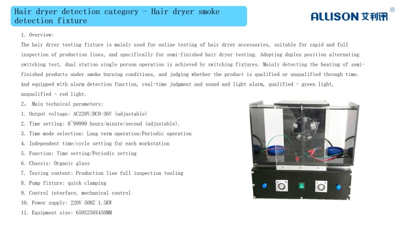The air duct temperature testing system is a professional testing device for hair dryers (air ducts) in working conditions. It fully complies with the requirements of the UL859 international safety standard. Install the system on the computer and connect it to the RS-23S/USB interface to test the data through the interface panel. And provide real-time demonstration and analysis of the data Can be used for 24-hour automatic testing. The characteristic of the data acquisition instrument of the wind duct temperature life testing system is that it can simultaneously collect up to 60 temperature points. Customers can analyze various temperature charts and collect data on the computer. The hottest five temperature positions of the wind duct can be displayed, and the temperature display of the entire test surface can be seen. These are not achievable by other acquisition instruments, and play an important technical reference value for the quality evaluation of the wind duct. It is also a necessary testing method in the wind duct industry, and is therefore adopted by major quality inspection institutions.
