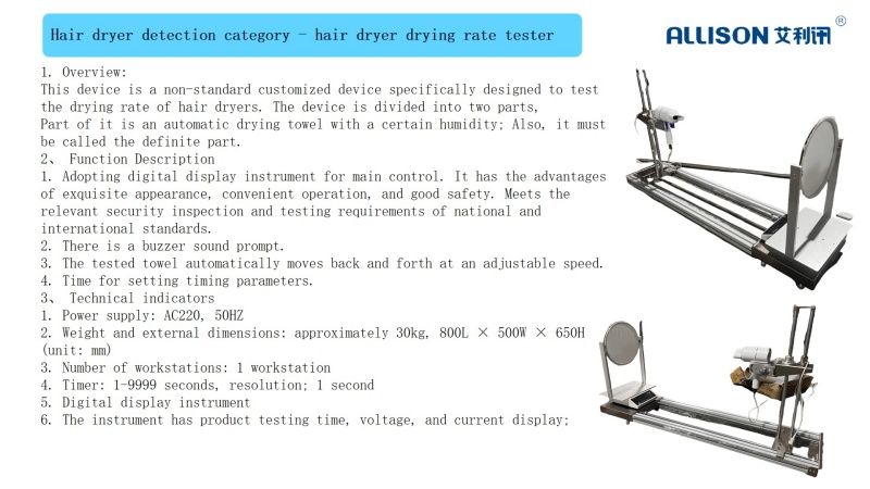Structural composition: Aluminum bracket is used to fix the hair dryer with a fixed fixture. An adjustable bracket is used to adjust the distance of 0-200mm for the tested hair dryer, with an adjustment accuracy of 1MM. The wind pressure is measured by an electronic scale with 485 communication function, with an accuracy of 0.01g. Relevant test data may be transmitted through data transmission.