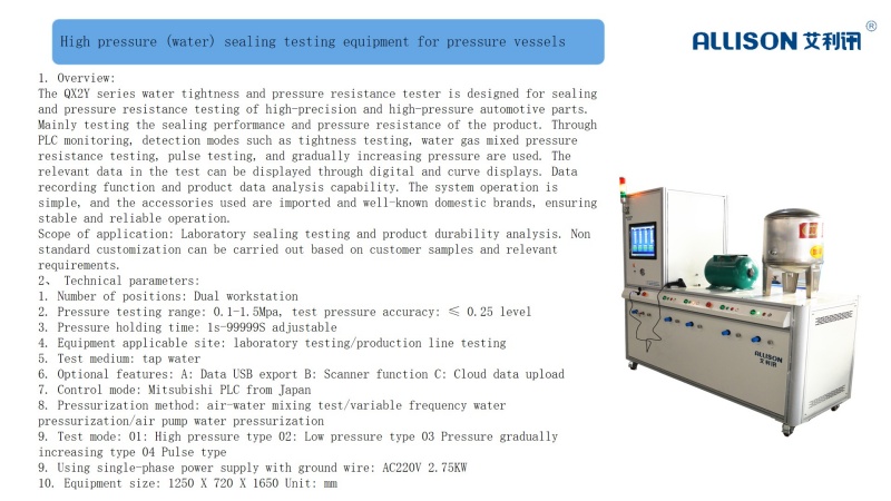 Spare parts pressure sealing/flow testing equipment, using high-pressure water source as the main pressure testing source, pressure transmitter and high-precision flow sensor to perform high-pressure sealing and flow characteristic testing on the tested products; The test water supply uses a constant temperature unit to maintain a constant test water temperature, and outputs a constant test sample at a test water temperature that can be set between 5-60 degrees Celsius. The test bench adopts PLC main control and 7-inch touch screen Chinese display; Determine the upper and lower limits based on the difference in pressure changes and the flow rate generated by the pressure and constant pressure output. Fixtures are universal fixtures that can achieve a maximum of 90% or more for diversified products based on customer provided product designs. OK automatically enters the next step of detection, NG corresponding indicator light is on, and there is an audible and visual alarm; The accessories used in the testing equipment are imported and well-known domestic brands, ensuring stable and reliable operation. The operation is simple and convenient, and the relevant test data supports USB export.