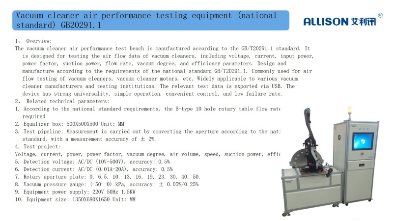 Industrial vacuum cleaner online testing platform (production line type) testing equipment, 1. Vacuum cleaner terminal testing (American standard) equipment manufactured according to F431-21 \ F558-17 standards, mainly suitable for testing parameters of vacuum cleaner performance testing platform, including voltage, current, input power, power factor, suction power, flow rate, vacuum degree, efficiency, filter self-cleaning function testing, low flow buzzer function testing, operating current under working conditions, and checking whether the vacuum cleaner has linkage function with the electric tool when the switch is turned to the control gear.