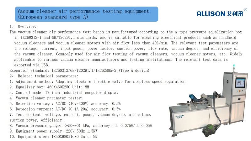 The air performance (production line) testing equipment for vacuum cleaner motors is mainly manufactured according to relevant testing standards such as GB/T20291-2014, IEC60335-2, IEC60312, etc. The air performance testing equipment is mainly used for comprehensive performance testing of the motor in vacuum cleaners. The testing parameters include motor motor, voltage detection, current detection, input power detection, power factor, suction power, speed, flow rate, vacuum degree, and efficiency. Through PLC control and monitoring, the actual simulated motor is tested under three operating conditions: fully open/fully blocked/13MM semi blocked, along with relevant air performance data. And determine the qualification and non qualification before leaving the factory through relevant parameters such as vacuum degree, flow rate, voltage, and current. Widely applicable to various vacuum cleaner manufacturers and testing institutions for comprehensive performance testing of vacuum cleaner motors.