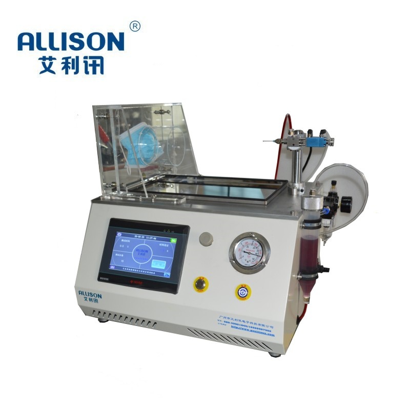 The synthetic blood penetration tester for medical protective clothing is suitable for assessing the resistance of protective clothing to synthetic blood penetration under different levels of test pressure. The working principle is to test the protective clothing material with synthetic blood under continuous pressure, visually inspecting the penetration of synthetic blood on the material.