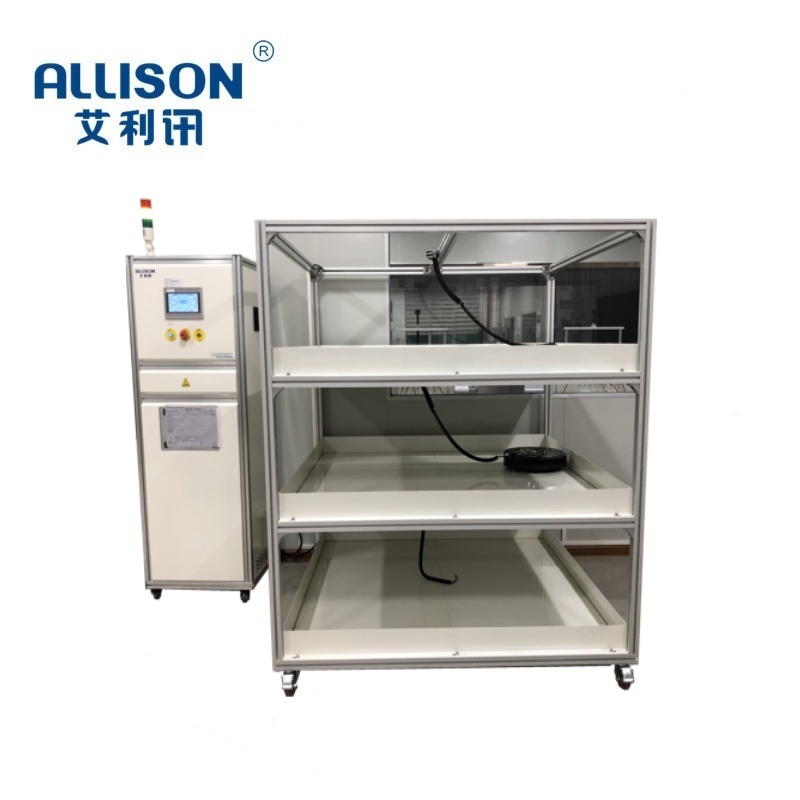 Vacuum robot running test bench/lifespan testing machine. The test rack adopts a three-layer distribution, and each layer can switch to different test floors according to actual testing requirements to simulate walking tests on different floors. The testing framework is composed of aluminum profiles and steel structures. Uninterrupted power supply is provided to each floor sweeping robot through an external DC power supply and a ten thousand conductive ring to ensure long-term walking life testing of the sweeping robot. The testing machine is controlled by PLC program, and the relevant values are set on a 7-inch touch screen. The relevant detection data can be exported through USB