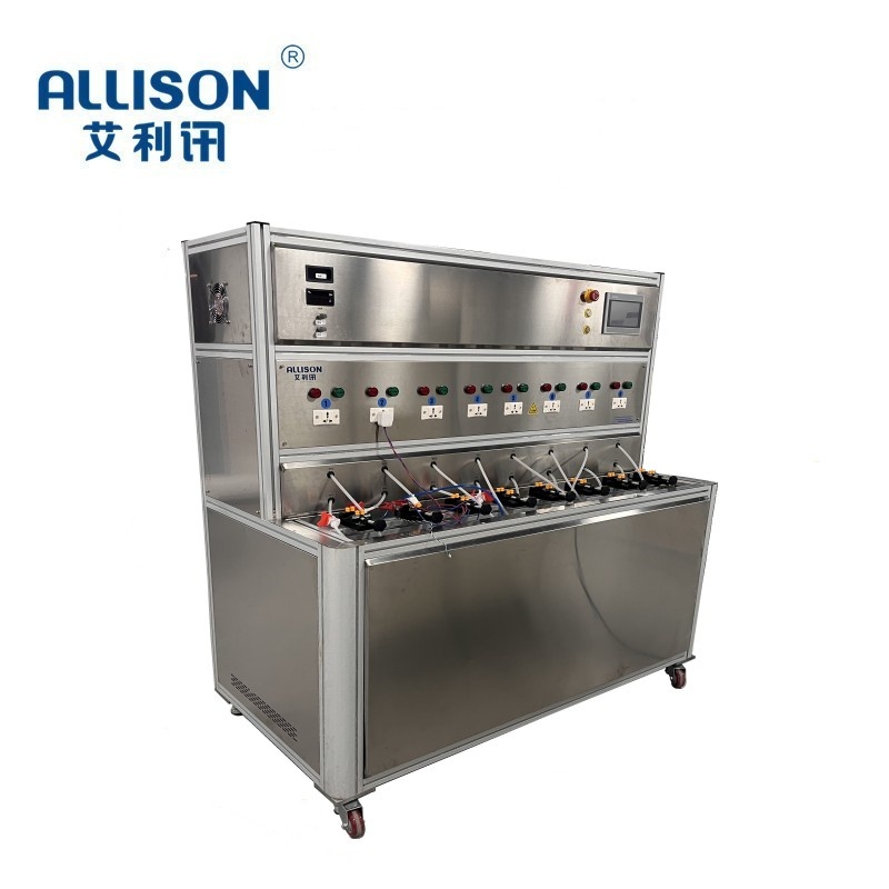 The water pump life testing equipment is used to monitor the long-term and interval time of the water pump to achieve power on and power-off aging testing. Users can also manually turn on/off or automatically turn on/off settings through the touch screen. Conduct durability tests on the tested water pump using three different testing liquids. The experimental area consists of single-layer equipment, with 10 testing stations, each powered by an independent power source for every 5 units. Each group uses a total of 3 test solution tanks (tap water, acid tank, alkali tank). The test solution is subjected to constant temperature testing at room temperature -70 ° C using an external heating plate. The device has the advantages of simple operation, convenient control, and low failure rate.