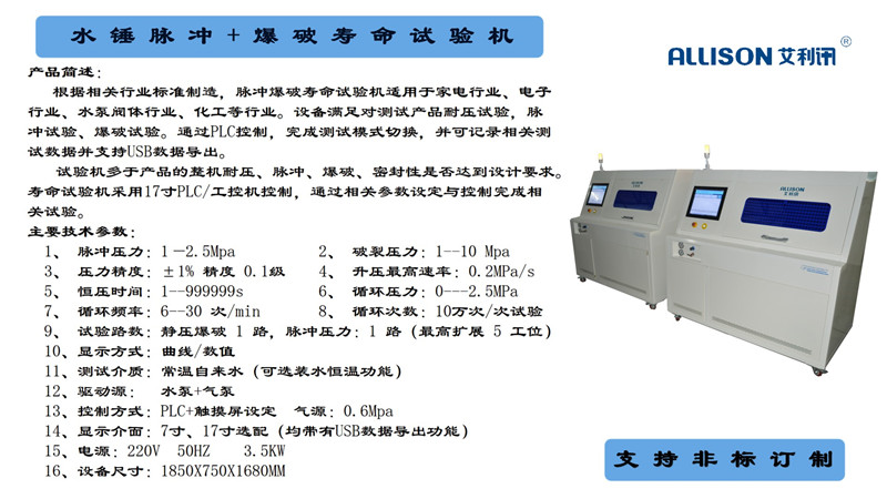 QX2Y系例水密性耐压检测仪台针对高精度、高压型汽车零配件进行密封检测、耐压测试等。主要检测产品密封性能与耐压性能。通过PLC监控,密性检测、水气混合式耐压性检测、脉冲式检测、压力逐渐进加压等检测模式。测试中的相关数据可通过数字式与曲线显示。数据记录功能与产品数据分析能力。系统操作简单,所用配件采用进口及国内知名品牌,工作稳定可靠。